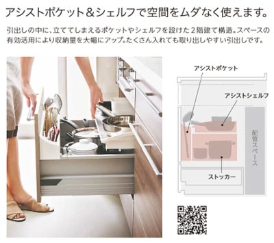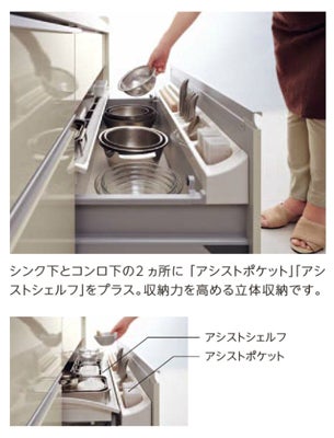 「アシストポケット」は、キッチンの引き出しにある収納機能で、シンク下引き出しとコンロ下引き出しに設定することができます。