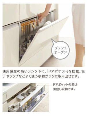 プッシュオープンで斜めに開くドアポケットは、素早くものを取り出すことができるため、料理中のムダな動きを省けます。手が濡れているときには、ヒザでポンと押して開けることができるため、扉を汚すことはありません。