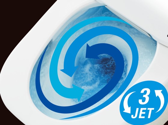 パワーストリーム洗浄は、3つの吐水口を利用して洗い流すため、水を無駄にすることなく便器内に巡らせることができます。