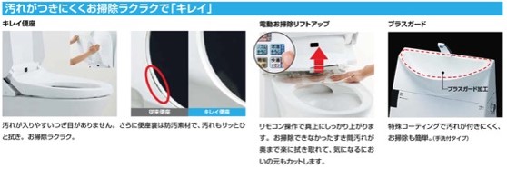 - 汚れがつきにくく掃除が楽な「キレイ便座」