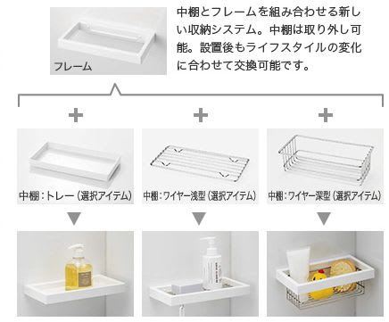 収納物に合わせて選べる中棚は3種類です。フレームに合わせる中身を、トレー・ワイヤー浅型・ワイヤー深型から選ぶことができます。