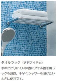 オプションによりタオルラックをつけることもできます。ビジネスホテルによくあるような仕様で、高い位置にラックを設置することができて、水がかかりにくいのが特徴です。シャワーを浴びた後に、サッと体を拭くことができるのがうれしいですね。