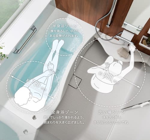3Dエルゴのバスタブ形状は、体の周囲を広くとり、足をゆったりと伸ばすことができます。想像以上に広く感じる浴槽で、のんびりと入浴することが可能です。